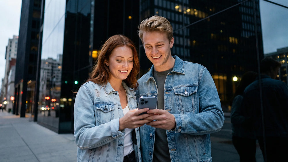 Hispanic man and woman in denim with flower motifs, by Alberta lake, choosing denim on phone.